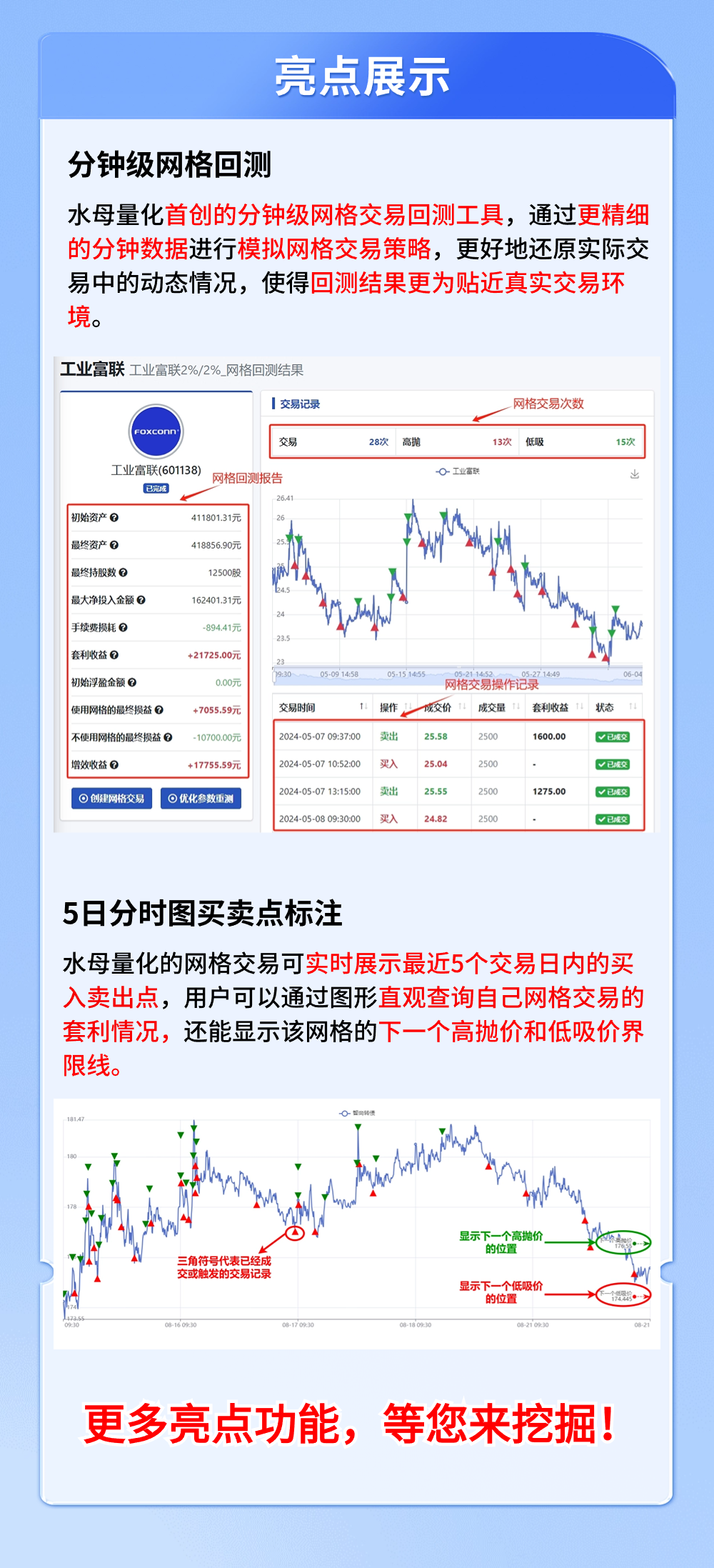 · 分鐘級網(wǎng)格回測啟用,精準(zhǔn)驗(yàn)證參數(shù),減少實(shí)盤風(fēng)險(xiǎn)。