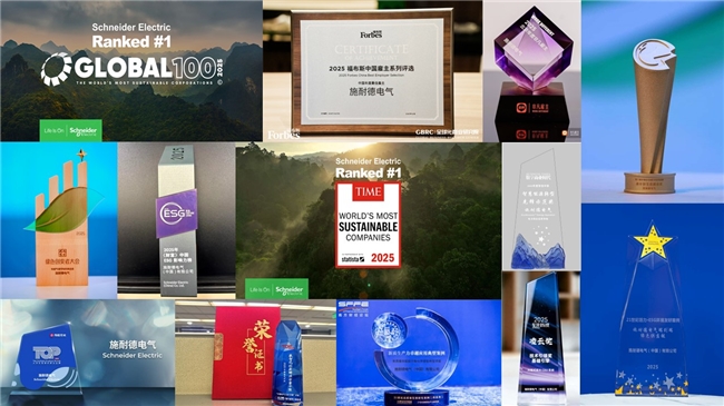 卓越的可持續(xù)成果贏得了全球范圍內(nèi)的廣泛贊譽(yù),施耐德電氣已在2024和2025年連續(xù)兩年榮登《時(shí)代》周刊與Statista聯(lián)合評(píng)選的“全球最可持續(xù)發(fā)展企業(yè)”榜首;連續(xù)14年入選企業(yè)爵士(Corporate Knights)“全球最佳可持續(xù)發(fā)展企業(yè)100強(qiáng)”, 并在2021和2025年兩度登頂榜首。在中國(guó),憑借在低碳轉(zhuǎn)型方面的突出貢獻(xiàn),施耐德電氣榮登“2025年《財(cái)富》中國(guó)ESG影響力榜”;還獲評(píng)《南方周末》“年度氣候行動(dòng)先鋒企業(yè)”及“2025工業(yè)制造雙碳行動(dòng)力TOP50”; 被《經(jīng)濟(jì)觀察報(bào)》授予“2024—2025年度受尊敬企業(yè)”等。